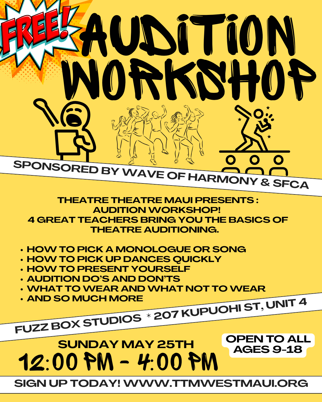 Join our Audition workshop before summer starts! If you want to hone your skills and get some tips on how to audition, we are holding an audition workshop on Sunday May 25th from 12pm to 4pm at Fuzz Box Studios in Lahaina. This workshop is open to anyone interested and you don’t have to be part of our summer program to participate.