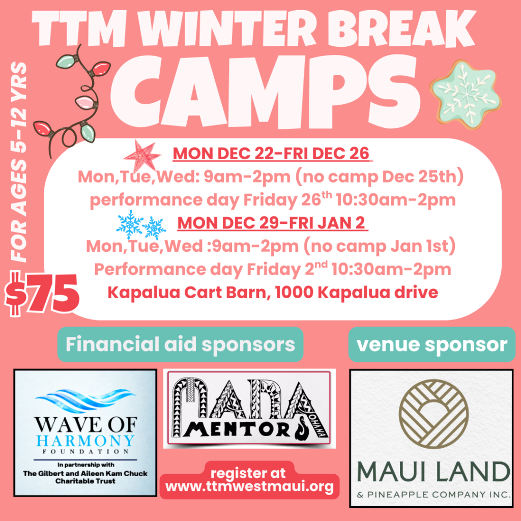 Financial Aid Sponsorship is provided by Mana Mentors and the Wave of Harmony Foundation in partnership with the Gilbert & Aileen Kam Chuck Charitable Trust. – please contact admin@ttmwestmaui.org for an application or download the application here